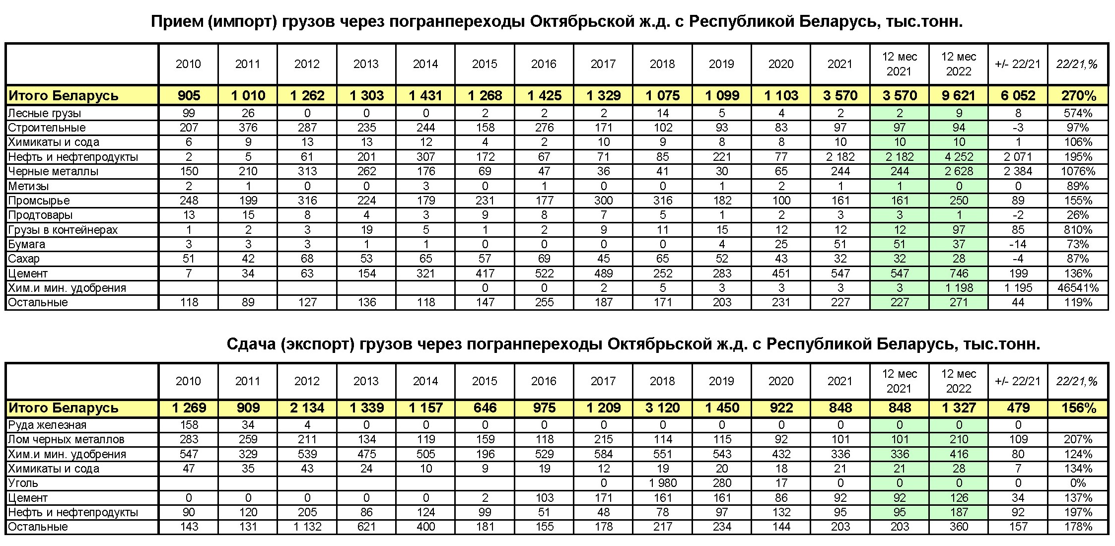 В 2022 году экспорт (вывоз) из Беларуси составил 9,6 млн. тонн, что в 2,7 раза, или на 6,1 млн. тонн выше 2021 года. Основные экспортные грузы: нефть и нефтепродукты – доля в экспорте 44 % (4252,4 тыс.т.), черные металлы – 27% (2627,7 тыс.т.), химические и минеральные удобрения – 12% (1198 тыс.т.), цемент – 8% (745,9 тыс.т.);