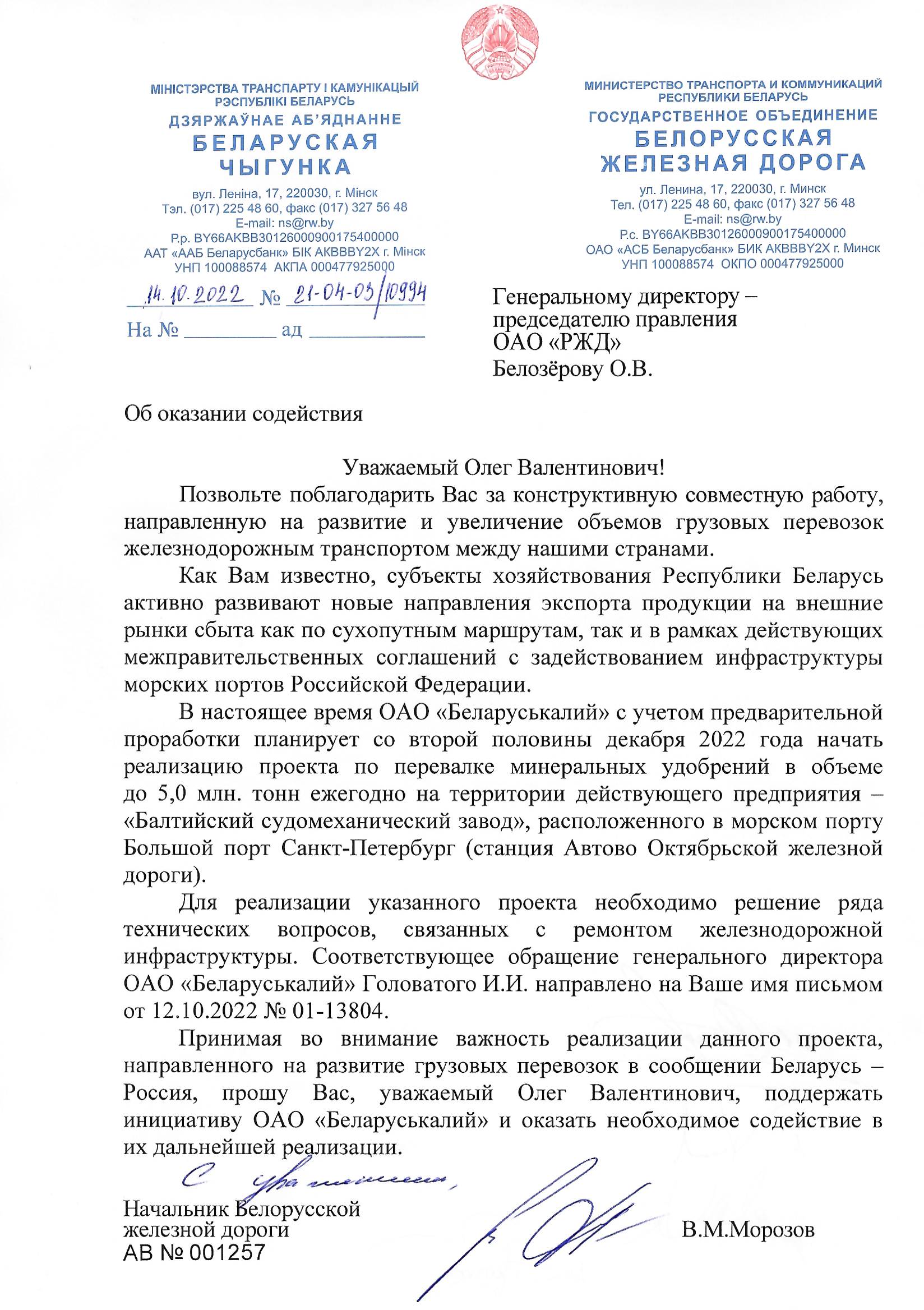 Письмо генеральному директору — председателю правления ОАО «РЖД» Белозерову О.В. от генерального директора ОАО «Беларуськалий» Головатого И.И.: