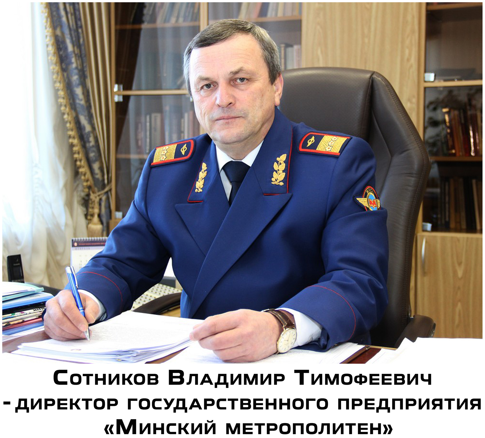 Сотников Владимир Тимофеевич — в 1982 году окончил Белорусский институт инженеров железнодорожного транспорта по специальности «Строительство железных дорог, путь и путевое хозяйство», работал бригадиром пути, старшим дорожным мастером Молодечненской дистанции пути БЖД (ПЧ-9). С 1983 заместитель начальника, а с 1991 главный инженер ПЧ-9. В 2002 назначен заместителем начальника Минского отделения БЖД (НОД-1), с 2012 — главный инженер НОД-1. С 2016 — директор государственного предприятия «Минский метрополитен».